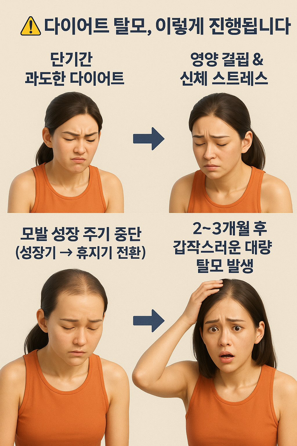 단기간 과도한 다이어트 → 영양 결핍 & 스트레스 → 모발 성장 중단 → 대량 탈모