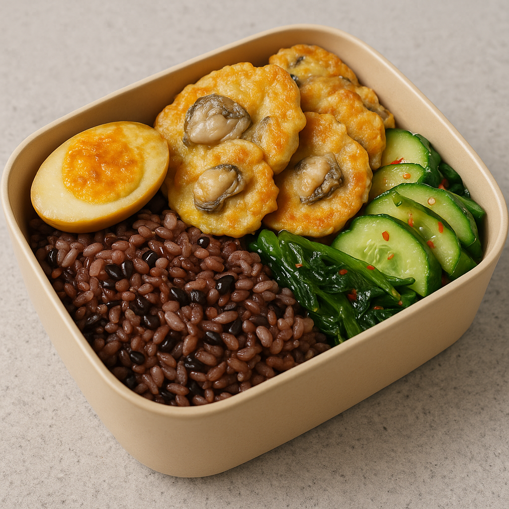 금요일( 굴전 또는 굴미역국 + 흑미밥 + 오이무침)